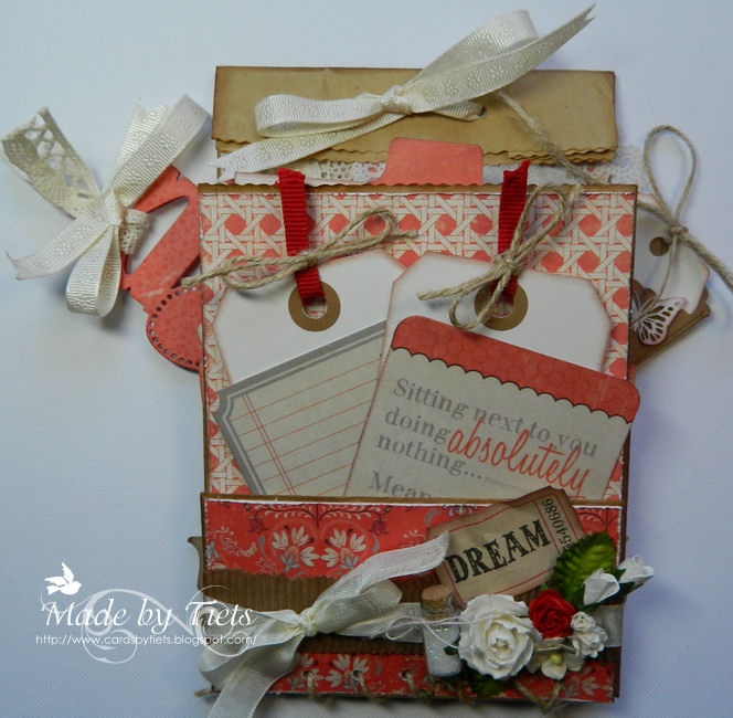 In mijn DT pakket zaten 2 paperbags en leuke crafts envelopjes van Mayaroad en een prachtig paperpadje en natuurlijk wilde ik dat graag combineren. Ik heb deze kreatie ermee gemaakt. Het prachtige papier is van Authentique-Carefree. De voorste paperbag is zo gevouwen dat er een pocket ontstaat zodat er 2 labels ingeschoven kunnen worden. Als je de voorste paperbag openklapt komt het craft envelopje tevoorschijn: