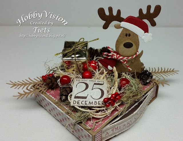Ik heb rudolf lekker tussen het kerst materiaal gezet , met een kadootje erbij en vond nog een oud stempeltje met 'do not open until 25 december!!' Leuke combi dacht ik zo!!