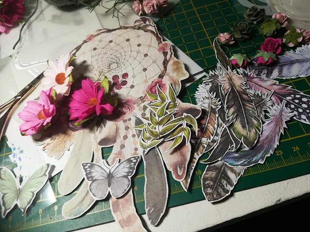 Als afbeelding op de dreamcatcher heb ik gekozen voor een afbeelding van de serie Gipsy Rose. Deze past perfect bij de dreamcatcher. De afbeelding is vastgelijmd met een lijmpistool. Zo blijft deze mooi vastzitten op het katoen.