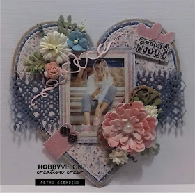 Het hart heb ik een keer uit kraft cardstock gestansd en twee keer uit het design papier. Van het blauwe cardstock heb ik die mooie stans gemaakt die dwars over het hart komt te liggen.