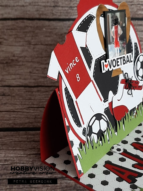 Links op de bal zit het leuke Ajax tenue. Dit heb ik zo zelf bedacht want je stanst in principe alleen het shirt en de broek uit. De voetballen op de kaart zijn uit zwart cardstock gestanst en de omtrek van de bal uit wit, door de mal om te trekken met potlood en uit te knippen. Rechts bovenin zit een foto van onze kleinzoon met daarachter een beker uit goudkarton.