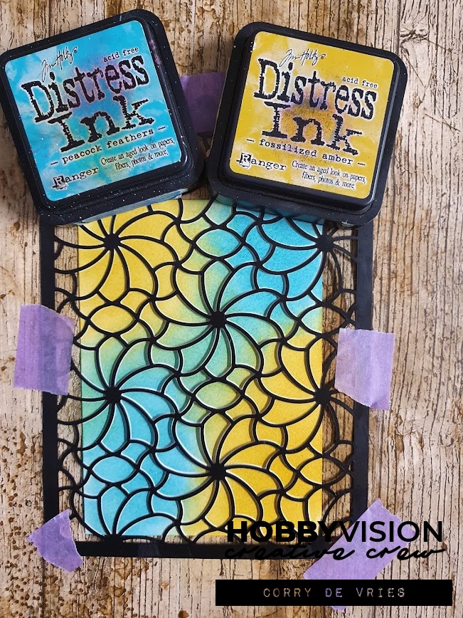 Ik ben de kaart gaan sponsen met twee kleuren Distress Inkt geel en blauw.