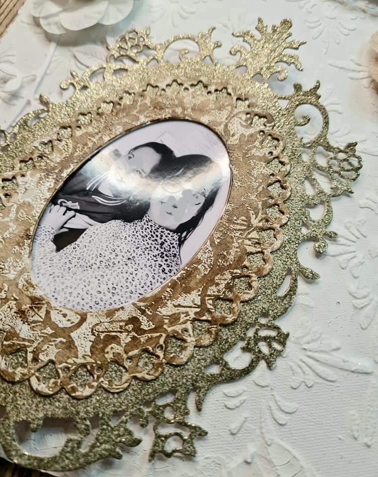 Het grootste lijstje is gekleurd met embossingpoeder. Het lijstje dat ik erop plakte heb ik eerst gestempeld met de barok achtergrondstempel en VersaMark. Door witte embossingpoeder als resist te gebruiken kreeg ik een gaaf effect nadat ik de kleur erop deed. In dit geval kleurde ik met Finnabair Liquid Acrylics.