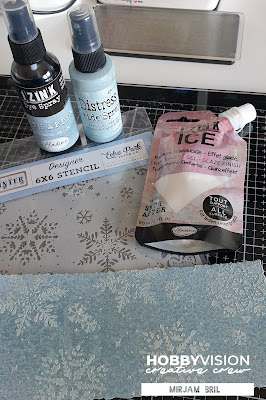 Toen het goed droog was, heb ik vervolgens met een stans van CreaLies (CLCZ183) de kleinste stans gebruikt en daarna heb ik de sneeuwvlokken aangebracht met een stencil en de Izink Ice paste Nacré Snowball.
