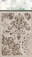 Nadat het papier hiermee is gekleurd is het nog meer bewerkt met een stencil van JMA en Distress Crackle Paste, een stempel van JMA afgedrukt met Versafine Onyx Black en een paar kleine vlindertjes met goud embossingpoeder bewerkt.