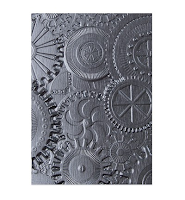 Voor een andere uitstraling heb ik een 3D Embossing folder van Sizzix Tim Holtz met Gears er bij gepakt en een 300 grams A6 Aquarel papier van Florence. Dit heb ik iets vochtig gesprayed, in de folder gelegd en door de machine gehaald. Dit is dan het effect wat je krijgt.