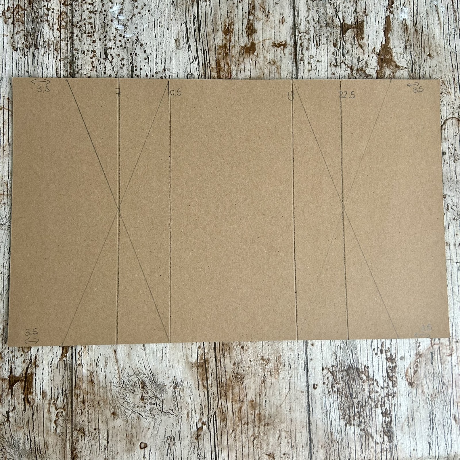 Stap 4 Vervolgens ga je de markeringen verbinden met de eerste rillijn, zoals ik hieronder op de foto heb gedaan. Er ontstaat dan een soort "zandloper" figuur. Je kunt deze lijnen eerst tekenen en dan rillen, maar je kunt ze ook direct rillen met jouw ril tool of ril apparaat.