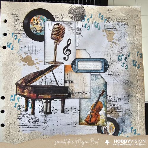 Ik was tevreden met de achtergrond en het was dus tijd om de plaatjes er bij te pakken. Hiervoor heb ik gewerkt met de oude Ciao Bella collectie Blue Note. Die collectie gaat over muziek, dus plaatjes vinden was niet heel moeilijk. De plaatjes heb ik uit het design papier geknipt en om ze er wat meer uit te laten springen heb ik de randjes met de kleur Nocturne aangezet. Qua compositie ben ik net zo lang blijven spelen totdat ik tevreden was. En daarna heb ik ze opgeplakt.